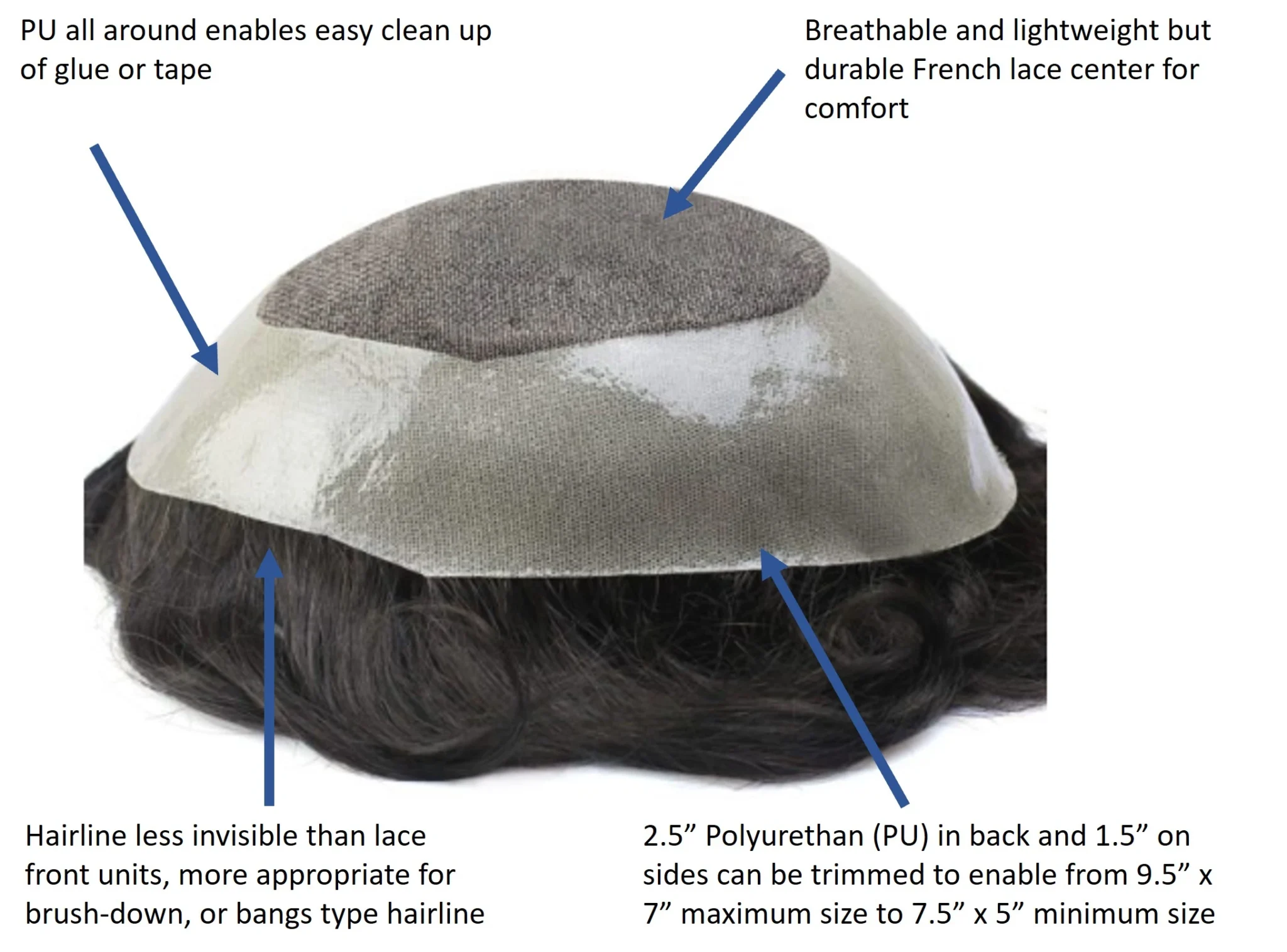 The French Lace PU Perimeter toupees are a very popular choice due to their breathable top, and substantial PU enabling easy cleanup and stable hold.  These hairpieces are durable while also comfortable to wear.